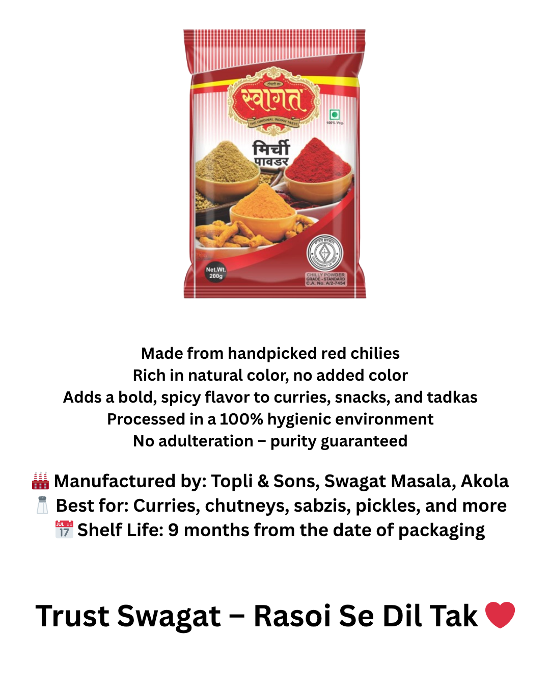 Add vibrant color and fiery flavor to your dishes with Swagat Mirchi Powder. Made from premium-quality dried red chilies, this spice is finely ground to preserve its natural aroma, heat, and taste.